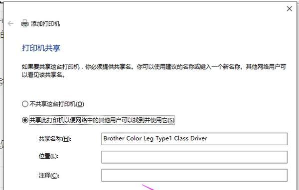 在接下来的对话框中,选择“共享此打印机”,并为其命名一个容易识别的共享名称。勾选“共享此打印机”,然后点击“下一步”完成设置。