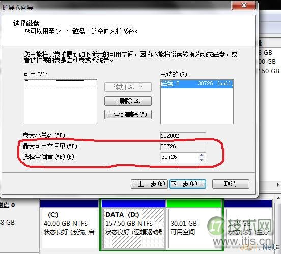 【六】选择被整合的空间量。因为是两个分区合并成一个,所以指定最大值。