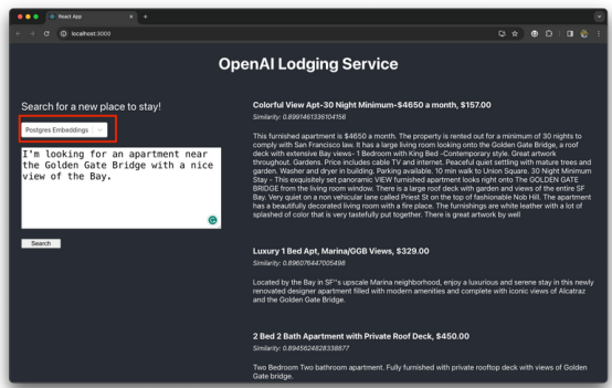 现在,从应用程序用户界面(UI)中选择Postgres Embeddings模式,并要求应用程序推荐一些与以下提示最相关的Airbnb住宿房源: