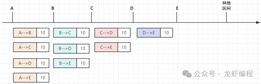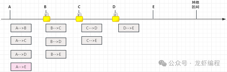 为什么12306会出现显示有票但是买不了,根本的原因是APP查询到的是脏数据的,12306的库存扣减是一个十分复杂的流程,它不像电商商品扣减库存那样的纯粹,如下图是A、B、C、D和E五个售票区间: