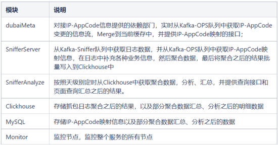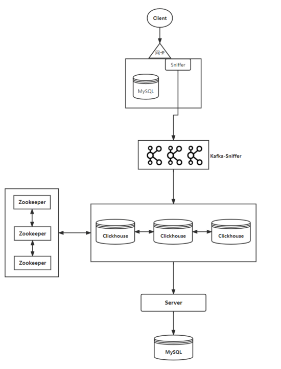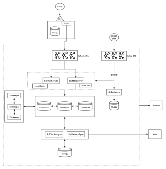 Sniffer 抓包之后将数据写入到 Kafka 中,Clickhouse 直接消费 Kafka 的队列中数据,并将数据 merge 到 Clickhouse 中。由 Server 程序按照天级别定时读取 Clickhouse 中的数据,分析、汇总数据,并解析请求 IP 对应的服务信息等,最后将结果写入到 MySQL 中。