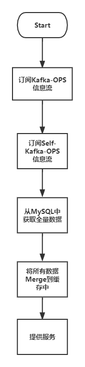 服务启动时首先从 Kafka-OPS 持续订阅信息流,所有变更信息 Merge 到内部缓存,然后再从 Self-Kafka-OPS 中持续订阅变更信息流,所有变更信息 Merge 到内部缓存,最后从 MySQL 中获取全量的数据信息,将所有数据 Merge 到缓存,组合成全量的数据。等到所有数据 Merge 完成,并且两个 Kafka 队列无堆积时,再提供服务。
