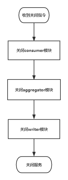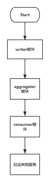 先启动 writer 模块,初始化 writer 模块的缓存和线程,再启动 aggregator 模块,初始化 aggregator 的缓存和线程,最后启动 consumer 模块,初始化 consumer 模块的线程和缓存。