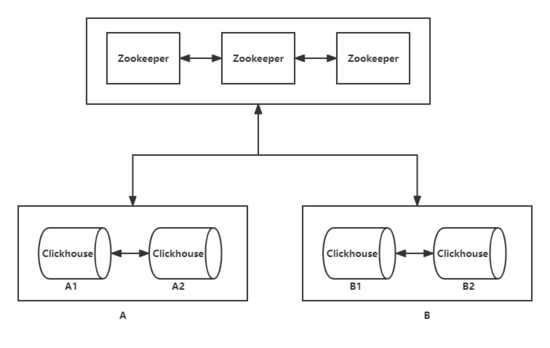 例如图示 Clickhouse 有两个分片(A 和 B),每个分片有两个副本([A1,A2],[B1,B2]),集群与三节点的 Zookeeper 通讯。