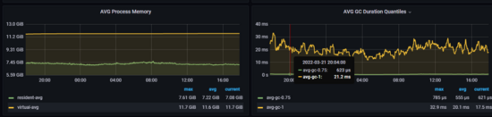 所有 SnifferServer 节点平均内存占用约为 12G 左右,最大 gc 平均约为 21ms,75 分位的 gc 平均约为 0.6ms。