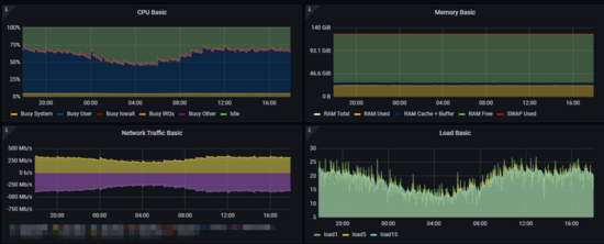 两节点 SnifferServer 合计 CPU(32核)利用率峰值约 70%,网卡峰值 上行约 330Mb/s 下行 400Mb/s。