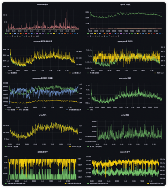 aggregator 平均每秒聚合 1.2 次,数据聚合比约为 40%,writer 每秒约写入 6 次,业务信息和 appCode 命中率几乎 100%。