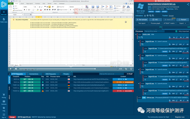 Emotet尚未展示完整的功能和一致的后续有效负载交付。使用在线恶意软件沙箱等现代工具来提高网络安全并有效检测此僵尸网络。保持安全和良好的威胁狩猎!