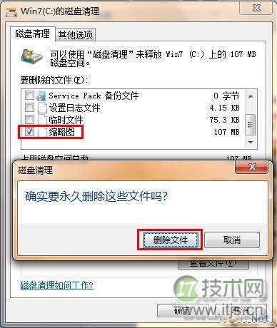 3.最后在“要删除的文件”一栏中,勾选“缩略图”项。略图之后再确认删除即可;如下图所示: