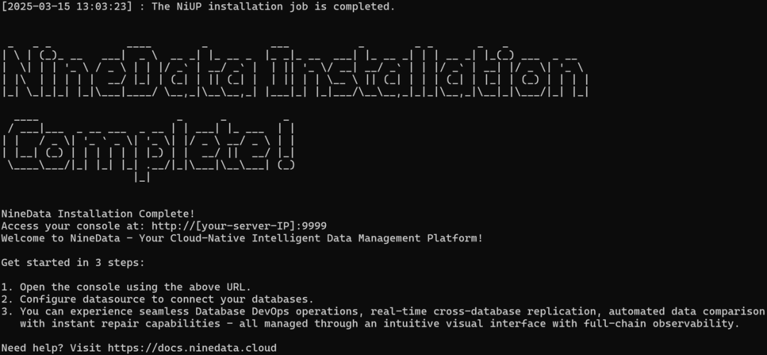 1).安装部署NineData 的安装部署是非常简单的,一方面用户可以直接使用SaaS的版本,也可以私有化安装部署。针对新发布的社区版本,官方还很贴心的提供了Docker镜像,简单拉起即可。我是通过在本地的镜像拉取方式做了部署。当在后台看到如下图片,就代表顺利启动。