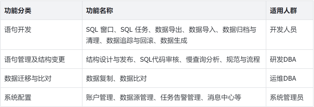 在上述页面中可见,NineData 内置了丰富的功能,DBA的很多操作都可以基于此平台去完成。我将整个功能大致分为四类,也对应四类使用人群。源码库