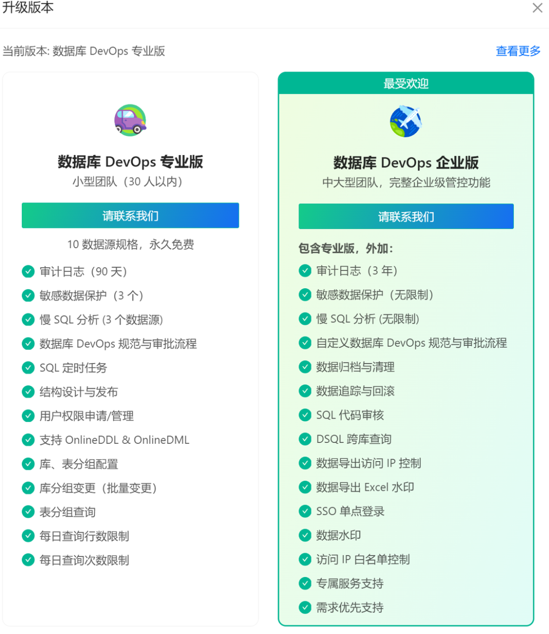 在上述功能中,数据归档与清理、数据追踪与回滚、SQL代码审核等高级功能,目前专业版尚未提供(此次也就未做测试),可选择升级到企业版来获得上述能力。