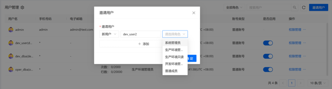 1).创建用户Ninedata已经默认提供了多种角色(普通成员、开发环境管理员、生产环境管理员及系统管理员),这对应于常见的不同场景用户。