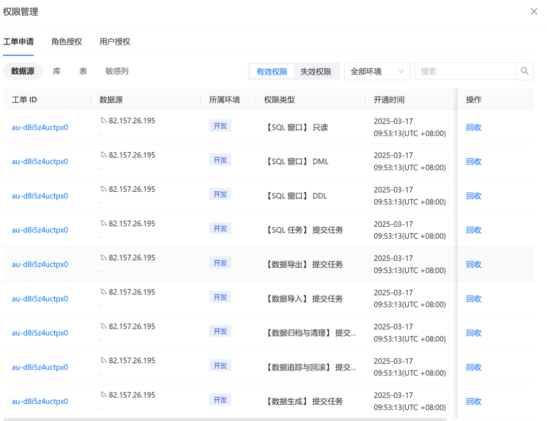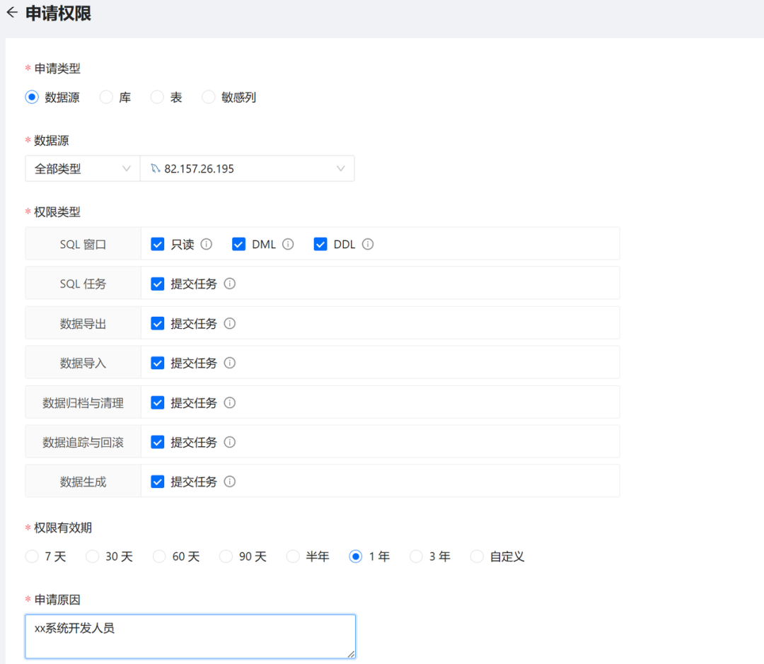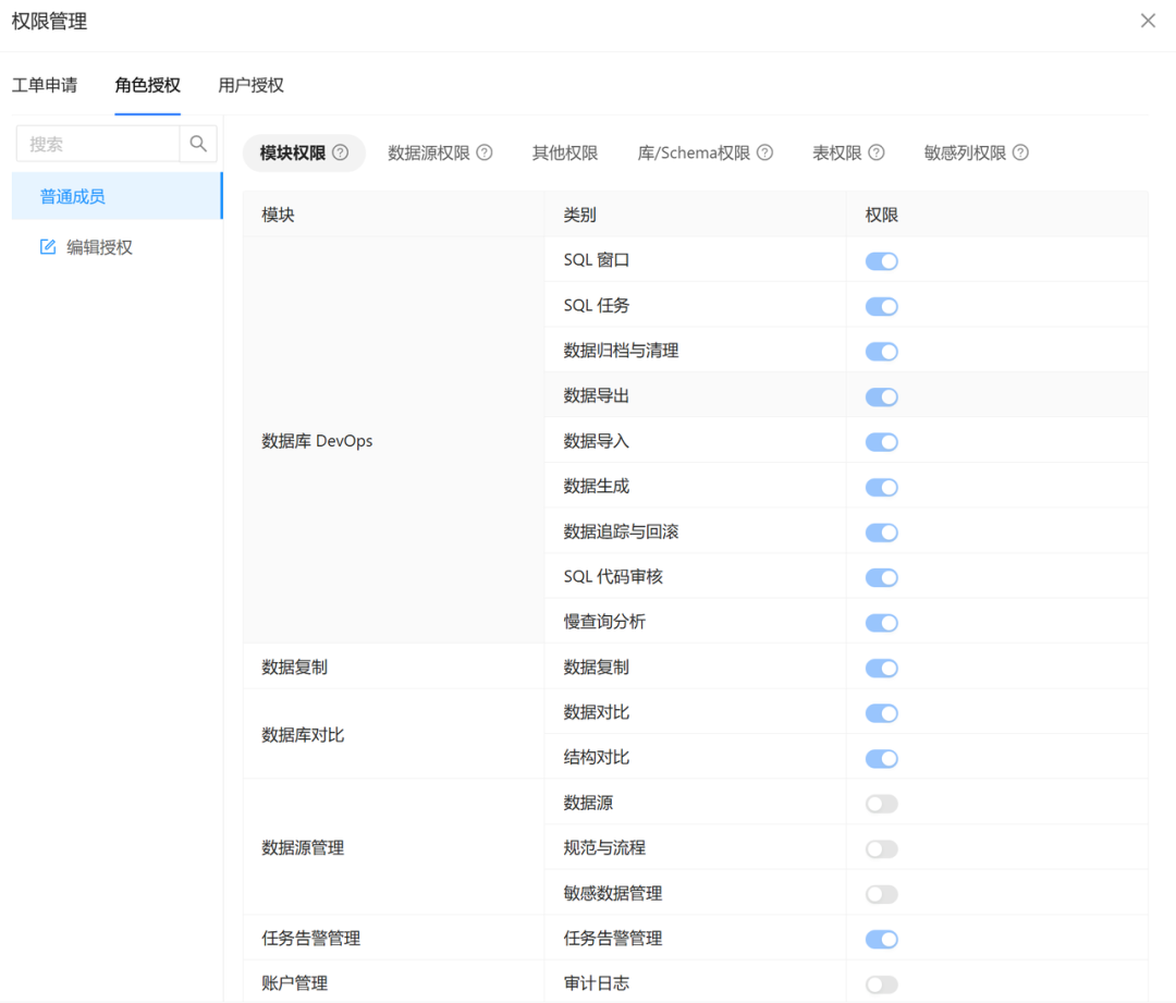 以普通用户为例,当用户第一次登录时没有任何权限,需进一步赋权才可用。这里的赋权粒度是非常细的,满足到数据源(实例)、库、表、列级别。