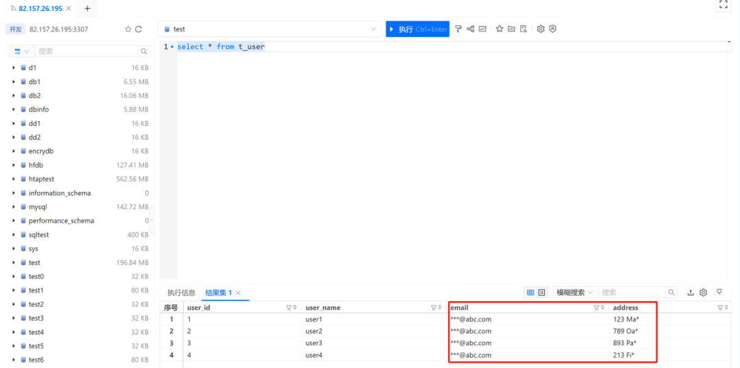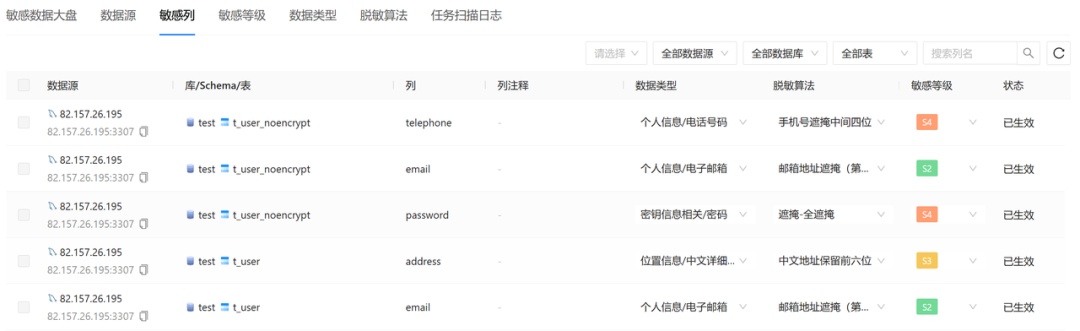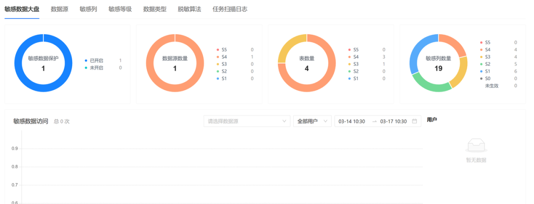 针对开发中的数据安全需求,系统贴心的提供了敏感数据识别及动态脱敏访问能力。用户通过对数据源启用敏感数据保护功能,并通过数据扫描完成初始配置。如下图可通过大盘查看整个敏感数据识别情况及具体某个库、表、列的敏感情况。一旦启用敏感数据保护,就可以在数据访问用脱敏后结果反馈,避免原文的泄露。