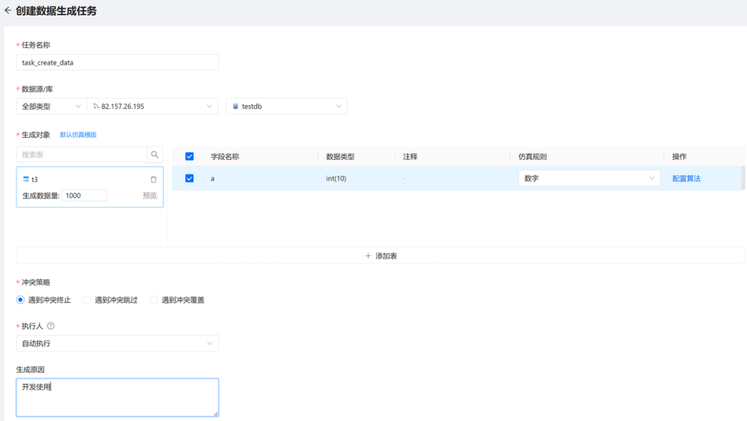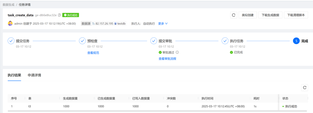 针对开发常见的要求之一,生成测试数据,系统提供了很多模版及算法配置来辅助完成,开发者提交数据生成任务后,可选择审核及执行者来完成复核动作。审核通过后,可选择执行。