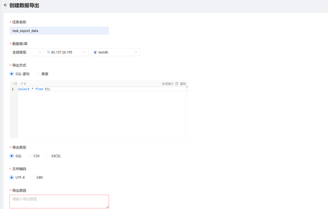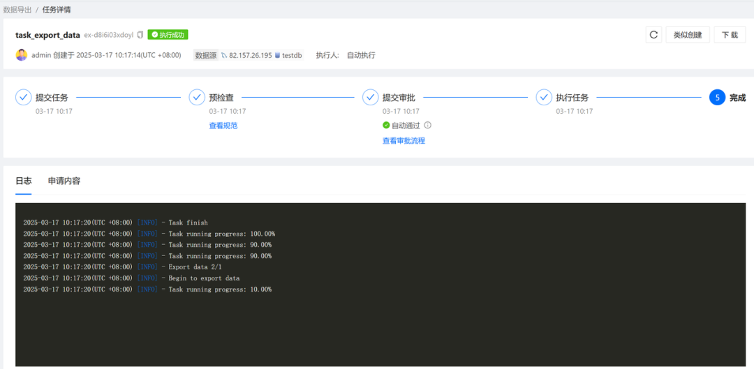 针对开发常见的要求之一数据导出,用户可通过任务的形式创建导出任务,指定审核及执行者并在审核完成后执行。其最终执行的结果,可通过下载的方式获得。