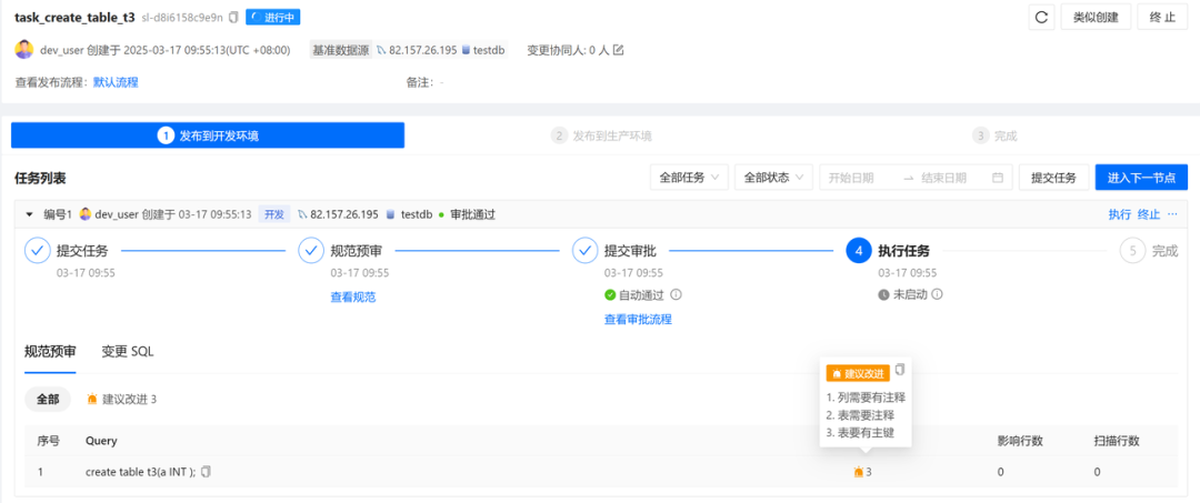 提交任务后,系统会进行必要的审核工作(审核内容都可以定义)。注意到下面的审核规则中给出了必要的提示,如列要有注释等等,用户可酌情修改;确认后可进入到下一步环节。