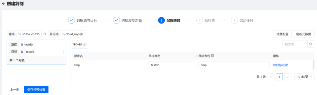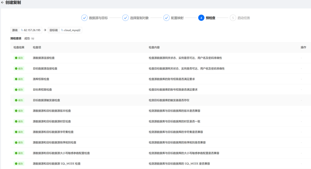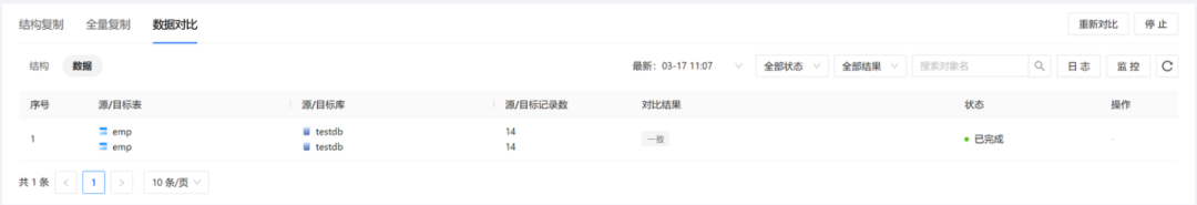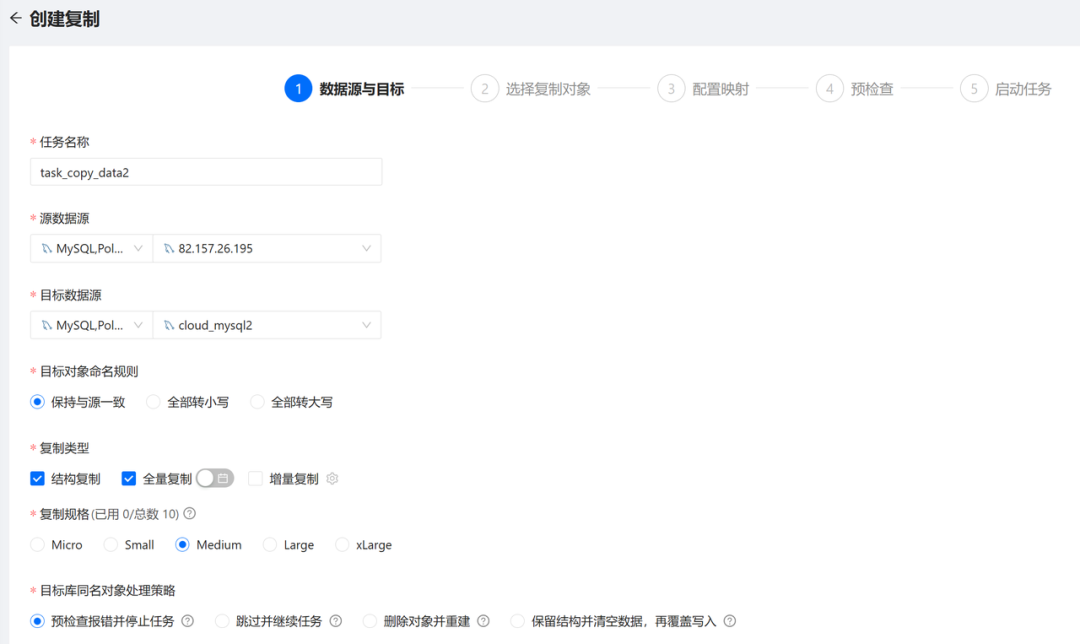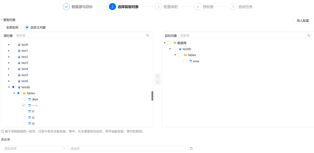 1).数据复制针对数据复制需求,系统提供了结构、数据及可选择的数据比对功能。数据复制中,用户可灵活选择数据源、数据对象、复制黑名单等,并在预检查完成后启动复制任务完成复制工作。这里有趣的是,同实例不同库间是不允许复制的,不知为何做了这样限制。除了上述复制能力外,也可以选择将数据对象结构单独复制或生产对应的DDL。