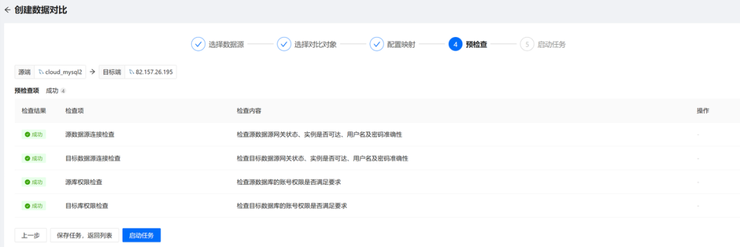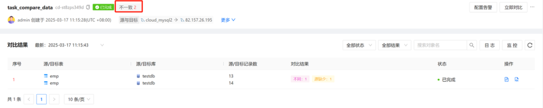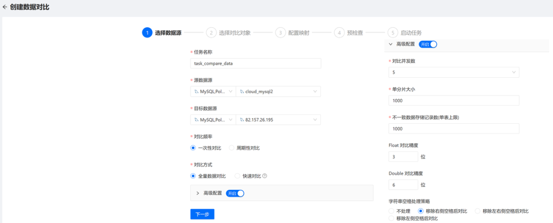 在数据比对中,选择不同数据源并可启动高级设置,针对比对细节进行调整;在之后选择比对对象并完成预检查后,创建比对任务。比对任务结束后,可对比结果,如有差异可直接查看具体差异内容,并生成数据变更SQL,用户可选择执行。