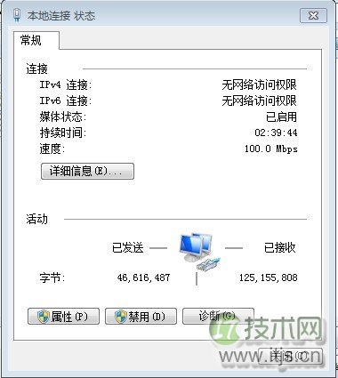 三、点击“本地连接”后即可打开“本地连接状态”属性对话框,如下图所示:
