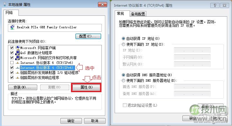 五、接下来我们选中本地连接属性对话框中的“Internet 协议版本4 (ICP/iPv4)”,然后选择下方的属性,之后即可进入“Internet 协议版本4 (ICP/iPv4)属性对话框”,在这里边即可更改DNS设置,如下图所示。