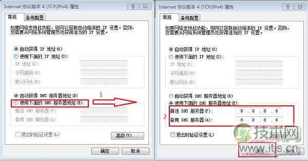 六、亿华云计算最后我们在Internet 协议版本4属性对话框中即可更高DNS地址了,方法是先选中“使用下面的DNS服务器地址”,然后在下方填写上需要填写上的DNS地址即可,比如可以填写成全球通用的8.8.8.8地址,如下图所示: