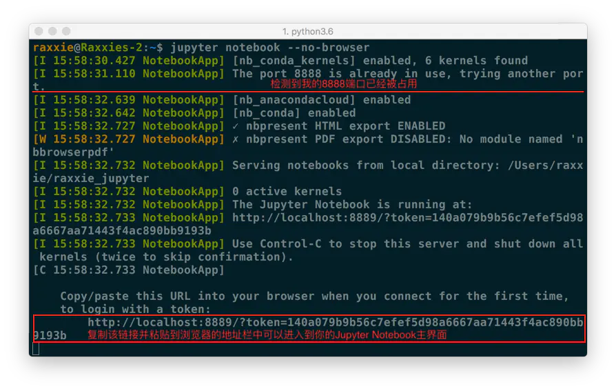 jupyter notebook --no-browser此时,将会在终端显示启动的服务器信息,并在服务器启动之后,显示出打开浏览器页面的链接。当你需要启动浏览器页面时,只需要复制链接,并粘贴在浏览器的地址栏中,轻按回车变转到了你的Jupyter Notebook页面。