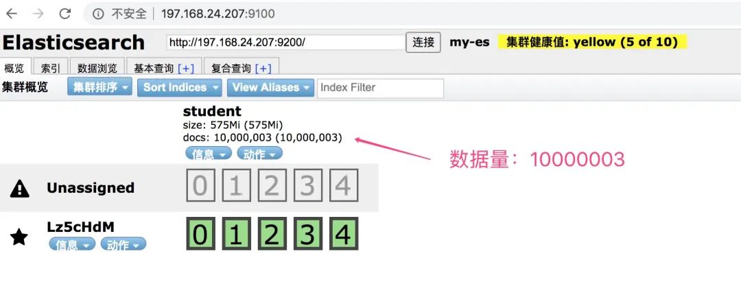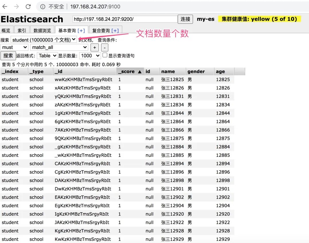 为了跟数据库中的数据量保持一直,小编也花了一些时间,将数据库中学生表的数据全部迁移到了 Elasticsearch 中!
