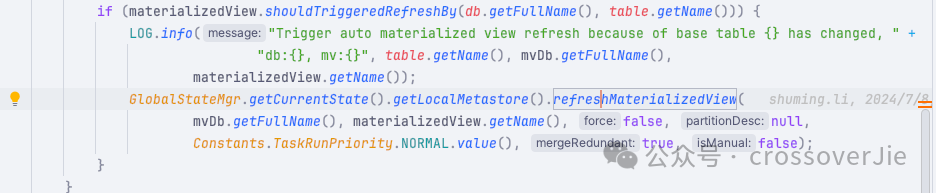 复制CREATE MATERIALIZED VIEW test.mv_test REFRESH ASYNC PARTITION BY a_time PROPERTIES ( "excluded_trigger_tables" = "par_tbl3", "excluded_refresh_tables"="par_tbl3" ) AS select date_trunc("day", a.datekey) as a_time, date_trunc("day", b.datekey) as b_time,date_trunc("day", c.datekey) as c_time from test.par_tbl1 a left join test.par_tbl2 b on a.datekey = b.datekey and a.k1 = b.k1 left join test.par_tbl3 c on a.k1 = c.k1;1.2.3.4.5.6.7.8.9.10.11.12.13.这样当在刷新数据的时候,会判断 excluded_refresh_tables 配置的表是否有发生数据变化,如果有的话则不能将当前计算出来的分区(1,2 两张表的全量数据)全部刷新,而是继续求一个交集,只计算基表发生变化的数据。