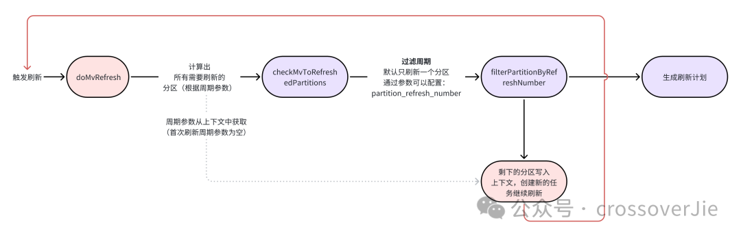 第一次触发刷新的时候是不会带上周期(比如时间范围),然后根据过滤计算出来的周期,默认情况下只会使用第一个周期(我们可以通过 partition_refresh_number 参数来调整单次刷新的分区数量)。