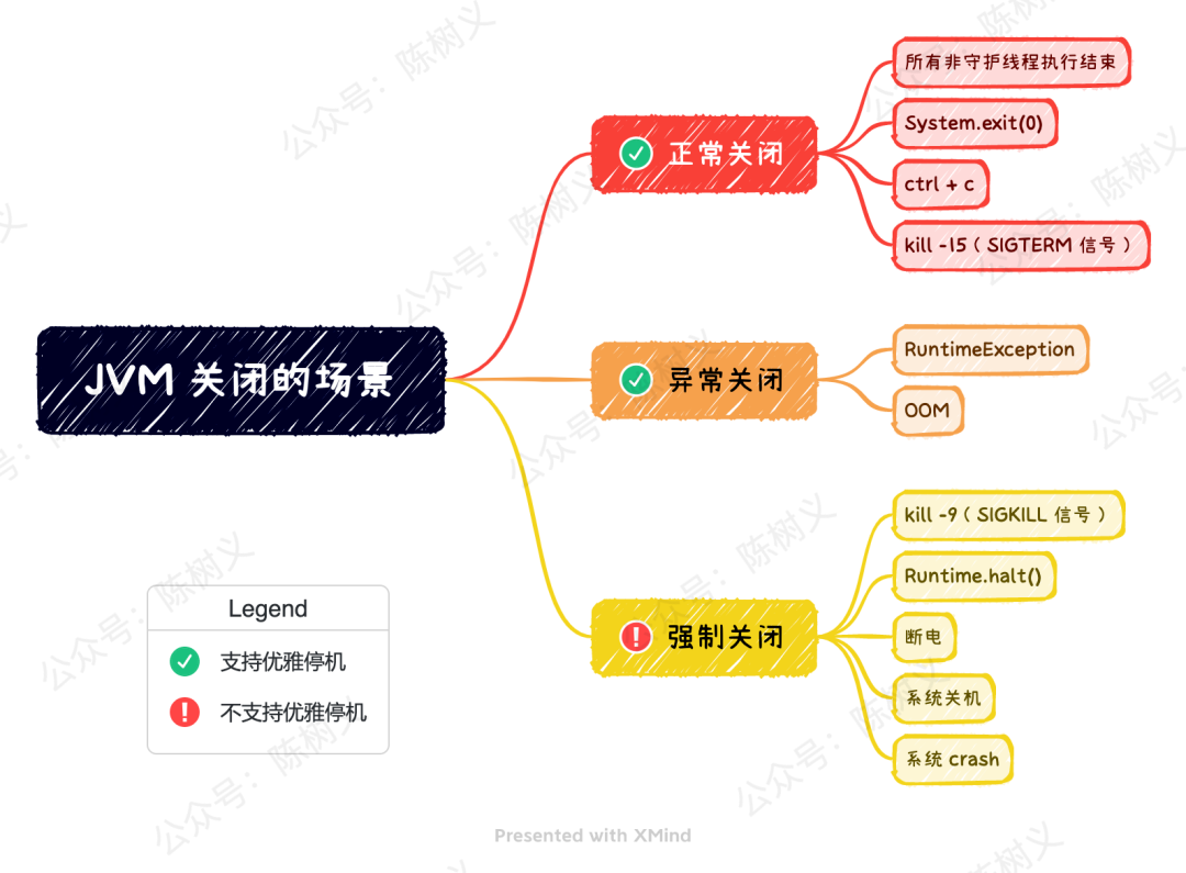 在学会怎么使用优雅停机之前,我们需要弄清楚优雅停机适用于哪些场景,那我们就需要先弄清楚 JVM 关闭的几种情况了。JVM 关闭的服务器托管情况可以分为 3 大类 11 个情况,如下图所示: