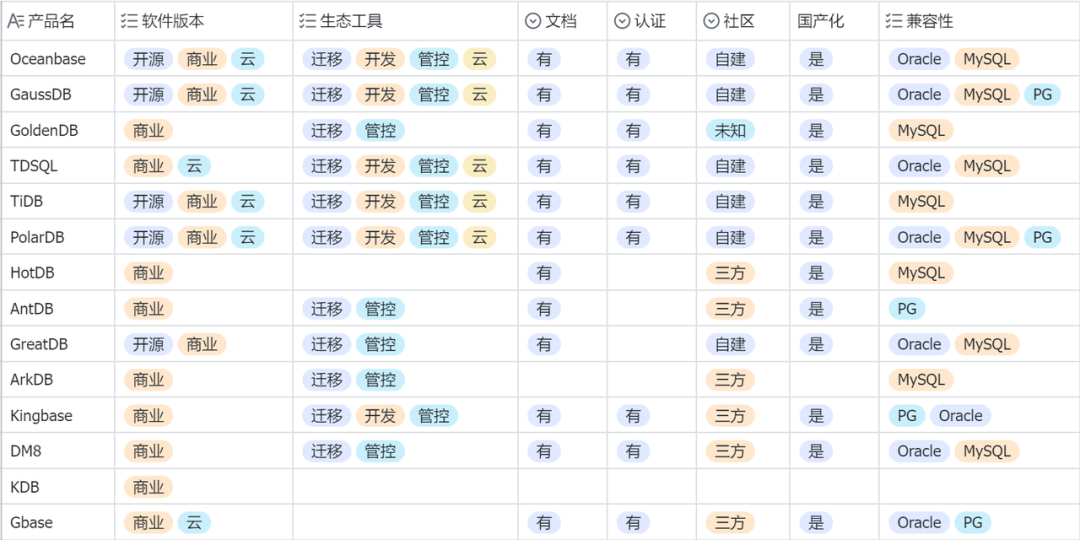 生态工具在生态工具层面,包括从数据库设计、研发、测试、管理、备份、优化等全方位的支持。这部分国产数据库产品存在一定劣势,之前国外数据库及开源产品构建了较为完善的生态,培养了一大批上下游生态企业。这里有条捷径,就是通过兼容性能力复用其他产品的生态。因此,很多国产数据库都提供了对MySQL、PostgreSQL、Oracle的兼容。这也成为很多企业选择的参考因素之一。此外,国内很多数据库生态厂商,也纷纷加大了支持国内数据库力度。
