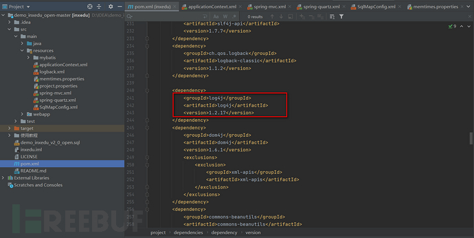 观察到项目使用了log4j 且版本为1.2.17,此版本存在反序列化漏洞CVE-2019-17571(经过分析,不存在此漏洞,因为本项目未使用产生此漏洞的类即SocketNode类)。