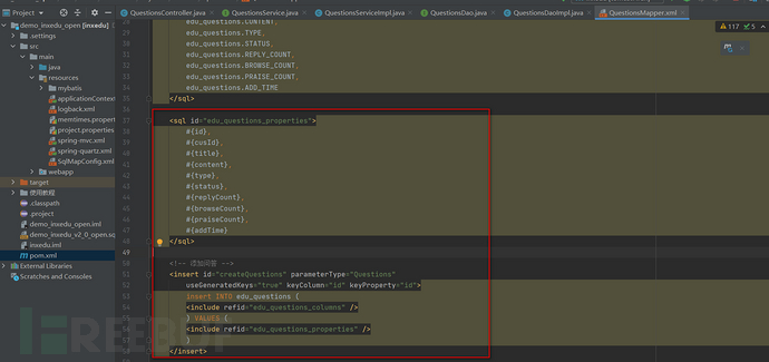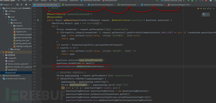 此处只有标题有XSS而内容无XSS,找到对应的入口进行分析原因,questionsService.addQuestions()为添加问答方法,追踪此方法