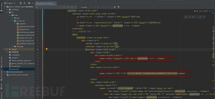 直接在*.jsp文件中搜索question/list找到对应的输出点。很明显标题处是直接拼接数据库中的值并未使用标签包裹,而内容处则使用了<c:out>标签。在jsp文件中,使用<c:out>标签是直接对代码进行输出而不当成js代码执行。