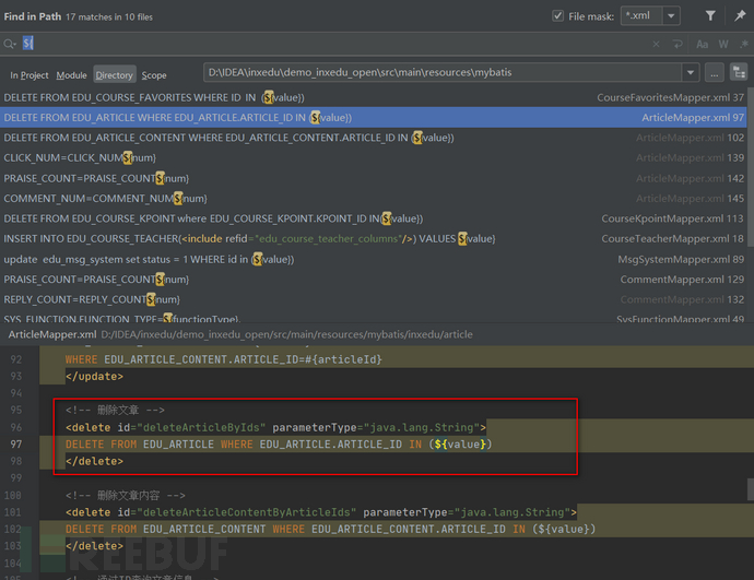 因为使用的时mybatis框架,所以直接在*Mapper.xml文件中搜索${即可。