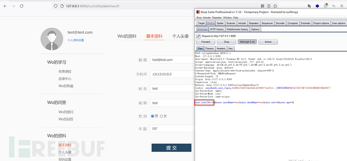 在用户修改个人资料时,直接抓包修改 user.userId参数值即可越权登录到其他存在的用户。