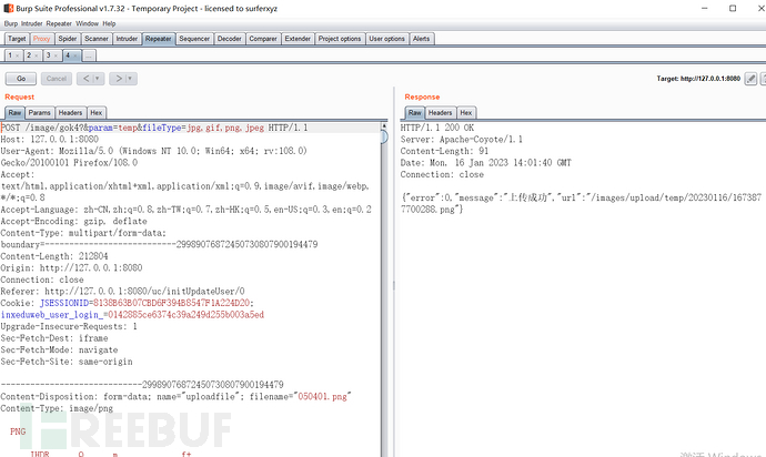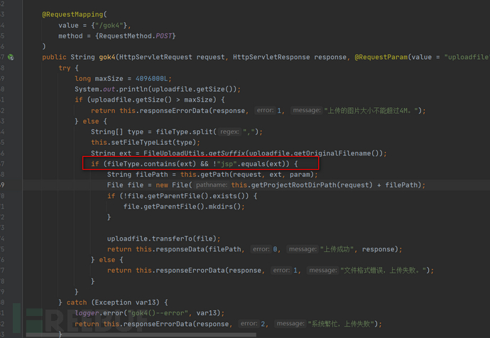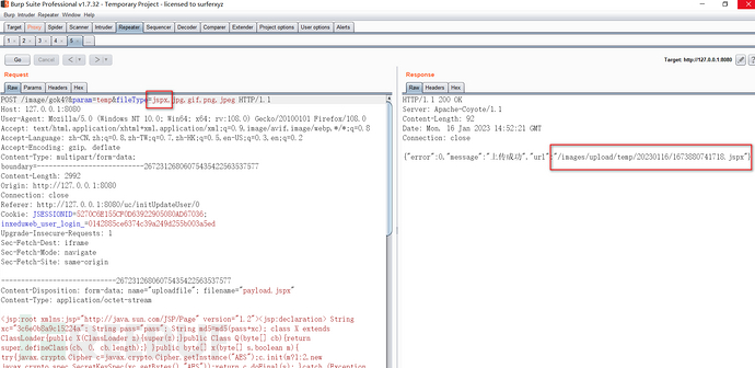 此处的fileType即为前端传入的文件类型后缀,分析代码可知,此处只过滤了jsp文件其他文件可随意上传,可以上传html文件造成XSS漏洞,由于此项目使用tomcat,所以可以上传jspx文件getshell。