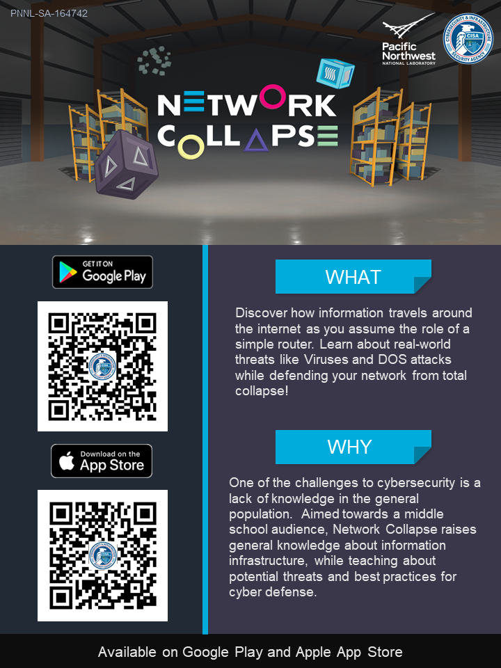 屡获殊荣的虚拟现实(VR)教育游戏Network Collapse已针对移动设备进行了重新构想和扩展!玩家可以在这款适用于Android和iOS的游戏中了解网络攻击和防御的基础知识。玩家必须将网络数据包路由到正确的目的地,并应用网络防御策略来保护他们的网络,同时管理不断扩大的网络——和不断扩大的威胁面——以保持流量顺畅运行。