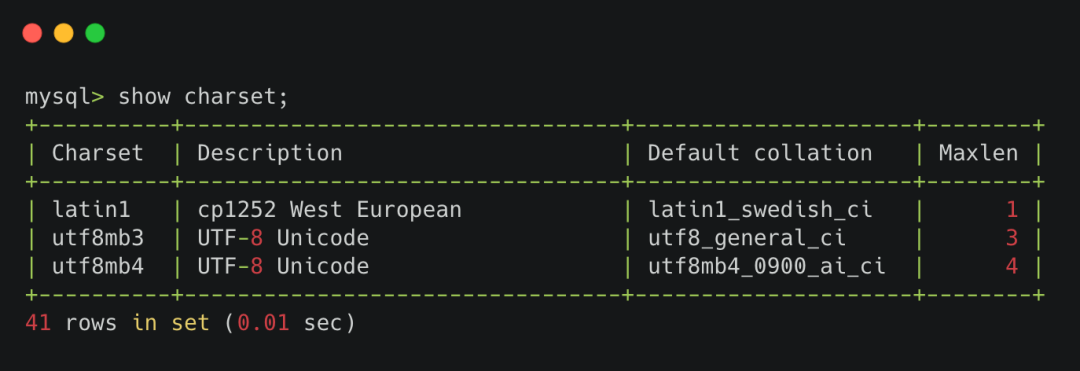 不同的字符集要求使用的字节个数也不同,我们可以通过 show charset; 看到mysql支持哪些字符集,以及这些字符集里存储一个字符所需的最大字节数(Maxlen)。