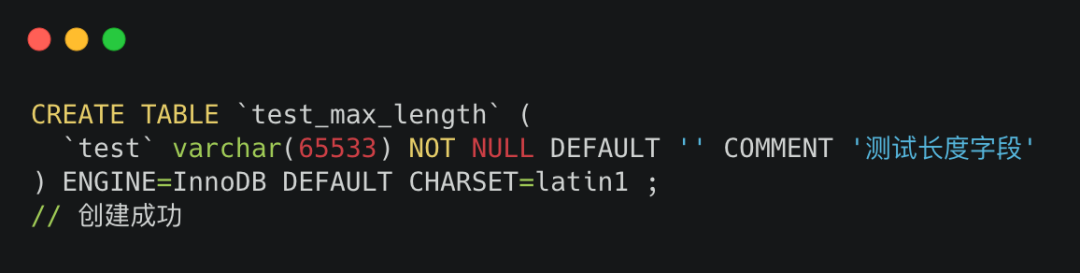 上面的建表语句里声明了test字段都是NOT NULL,也就是非空,如果我们将这个改成可以为NULL,再用 CHARSET=latin1去试试。这时候就会发现,前面NOT NULL的时候最大能使用65533去建表,现在报错了。