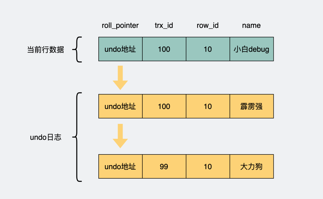 比如Row_ID,这个是在建表是没有声明主键时,数据表自动会生成的隐藏主键。另外还有trx_id字段,用于记录当前这一行数据行是被哪个事务修改的,和一个roll_pointer字段,这个字段是用来指向当前这个数据行的上一个版本,通过这个字段,可以为这行数据形成一条版本链,从而实现多版本并发控制(MVCC)。有没有很眼熟,这个在之前写的文章里出现过。