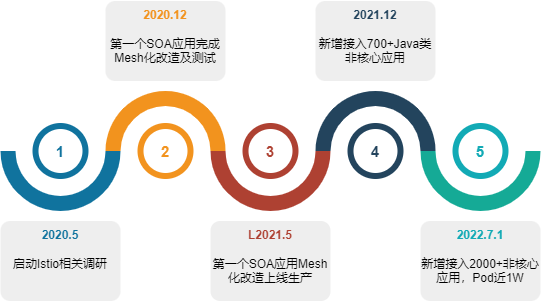 1.1 携程Service Mesh发展从2020年中,我们依托K8S底座能力,进行Service Mesh技术预研,深度定制Istio,并与携程框架部门合作进行了小规模的落地试点。2021年底,接入非核心应用600+,为Service Mesh在携程的最终落地奠定基础。到目前为止,生产环境已有2000个应用(业务POD数近1W)接入,预期下半年推进核心应用的接入。