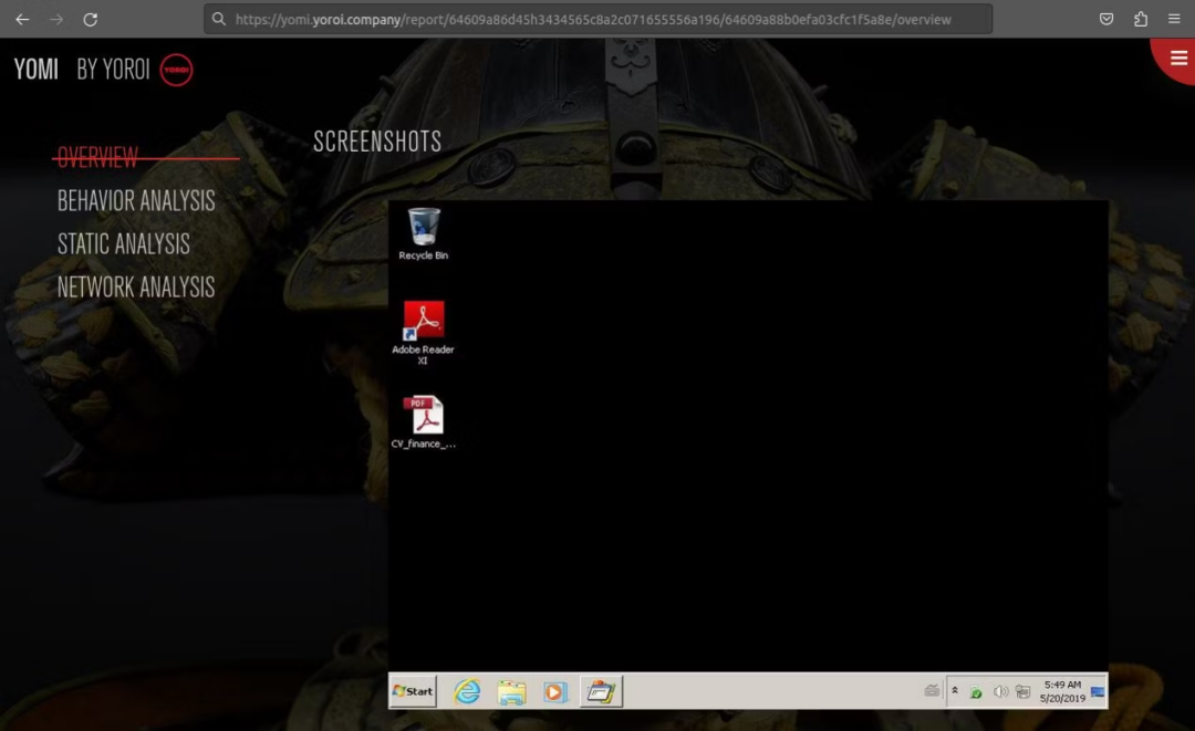 Yomi The Malware Hunter需要用户在完成注册后才能使用文件上传和检测功能,它可以检测目前大多数的恶意软件威胁,并提供全面的静态分析、行为分析和网络分析服务。以图文并茂的方法展示分析结果是Yomi The Malware Hunter的一个主要应用特点。作为沙箱分析的一部分,它还可以生成屏幕截图,为用户提供可疑文件或异常行为检测结果的最直观展示。这项特性可以使分析结果解读起来更简单直观,尤其适用于非安全专业人员的使用。