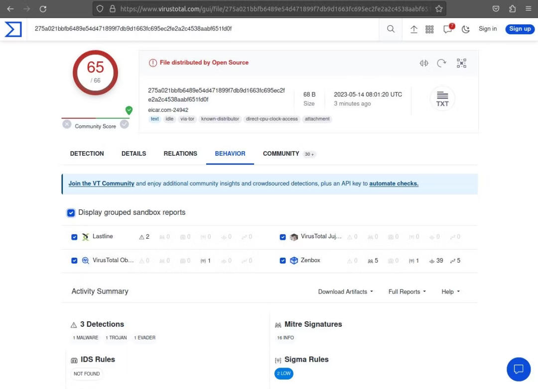 VirusTotal是一项非常流行的云沙箱服务,提供针对各种恶意软件的快速检测和分析功能。VirusTotal还可以结合利用最新的反病毒引擎和虚拟机技术,从而实现快速而全面的恶意软件报告机制。