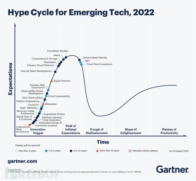 Gartner 2022成熟曲线(也称“炒作周期”)确定了25种必须了解的兴技线新兴技术,旨在为企业架构和技术创新领导者提供帮助: