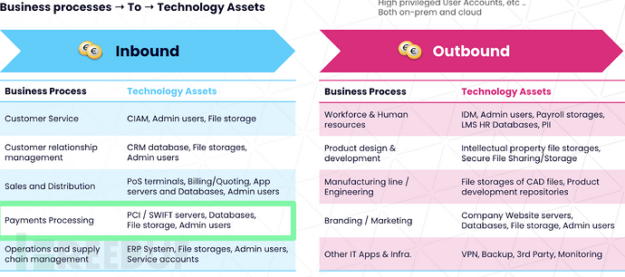 现在已经对最重要的业务流程有了更深入的了解,可以开始将每个流程映射到底层技术资产上,包括应用服务器、数据库、安全文件存储、特权身份等,这些都是企业的关键业务资产。