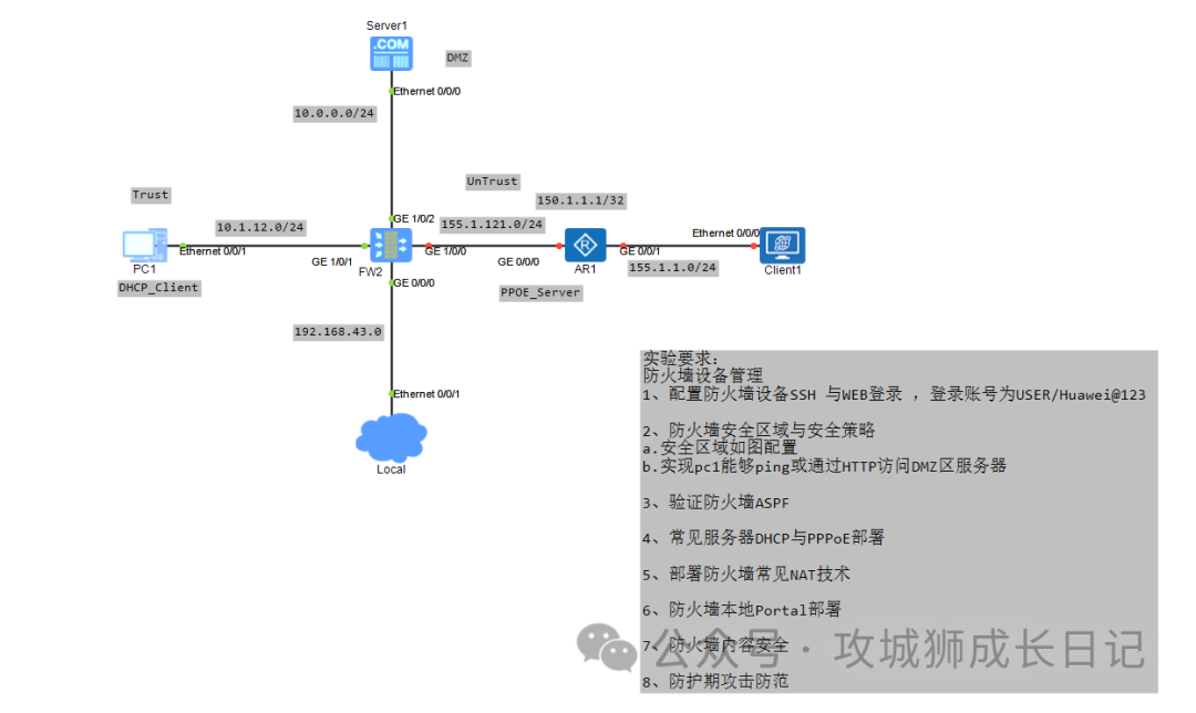 今天接着上一节的墙安全区全防实验拓扑图,继续完成今天的域策任务:防火墙安全区域与安全策略,实验拓扑如下图: