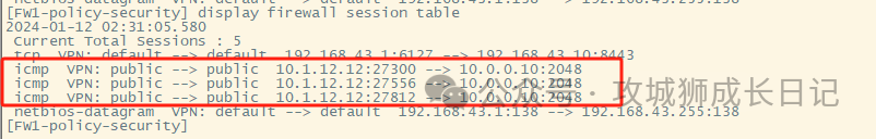 复制[FW1]display firewall server-map 2024-01-12 02:59:52.790 Current Total Server-map : 1 Type: ASPF, 10.1.12.20 -> 10.0.0.10:2052, Zone:--- Protocol: tcp(Appro: ftp-data), Left-Time:00:00:13 Vpn: public -> public1.2.3.4.5.6.还会生成会话表项,如下: